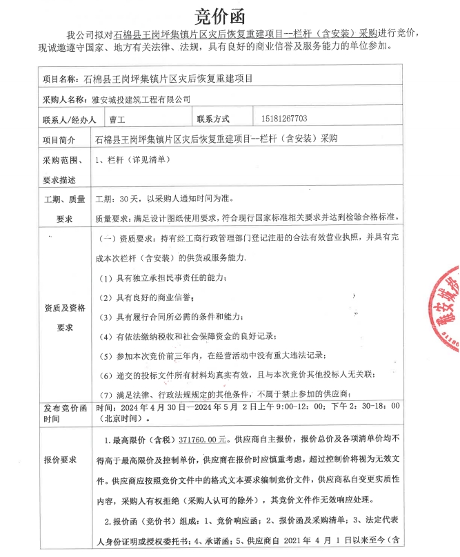 石棉縣王崗坪集鎮(zhèn)片區(qū)災(zāi)后恢復(fù)重建項(xiàng)目--欄桿(含安裝)采購(gòu)競(jìng)價(jià)公告