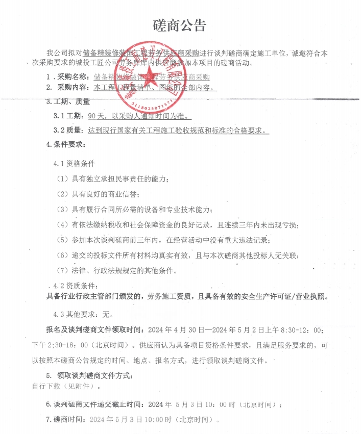 儲(chǔ)備精裝修裝飾工程勞務(wù)供應(yīng)商采購(gòu)談判磋商公告