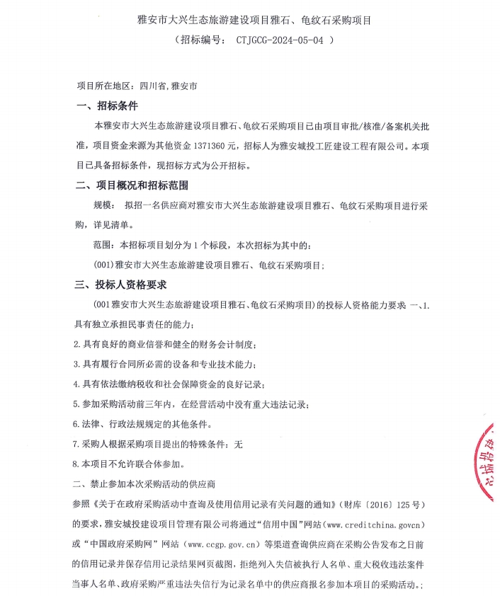 雅安市大興生態(tài)旅游建設(shè)項(xiàng)目雅石、龜紋石采購項(xiàng)目公告