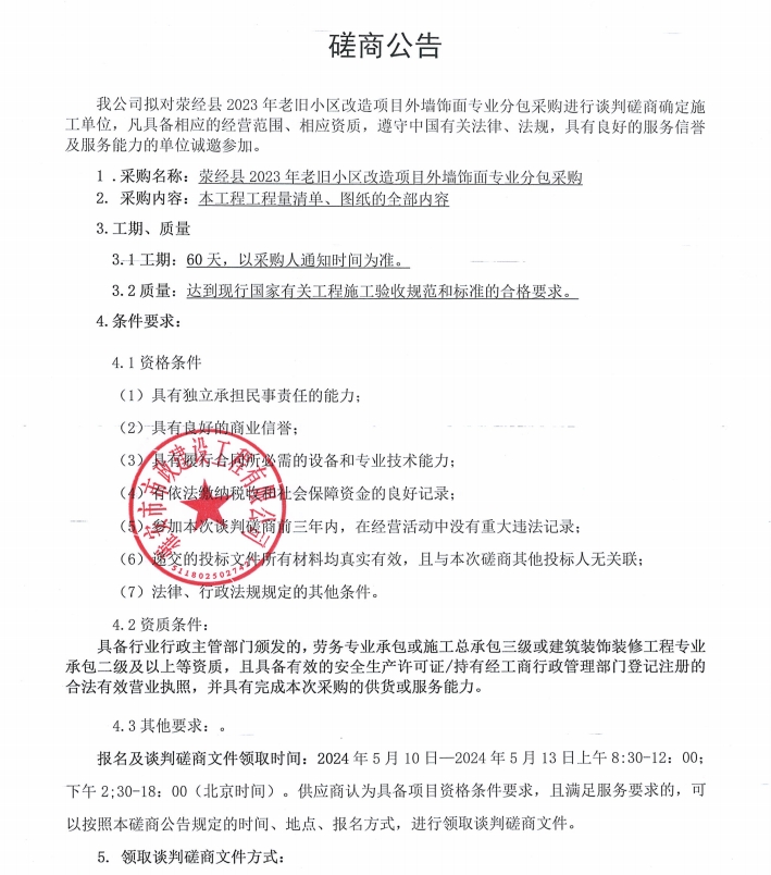 滎經(jīng)縣2023年老舊小區(qū)改造項目外墻飾面專業(yè)分包采購磋商公告