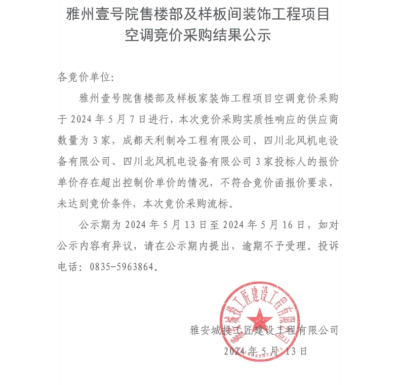 雅州壹號院售樓部及樣板間裝飾工程空調(diào)競價采購結(jié)果公示