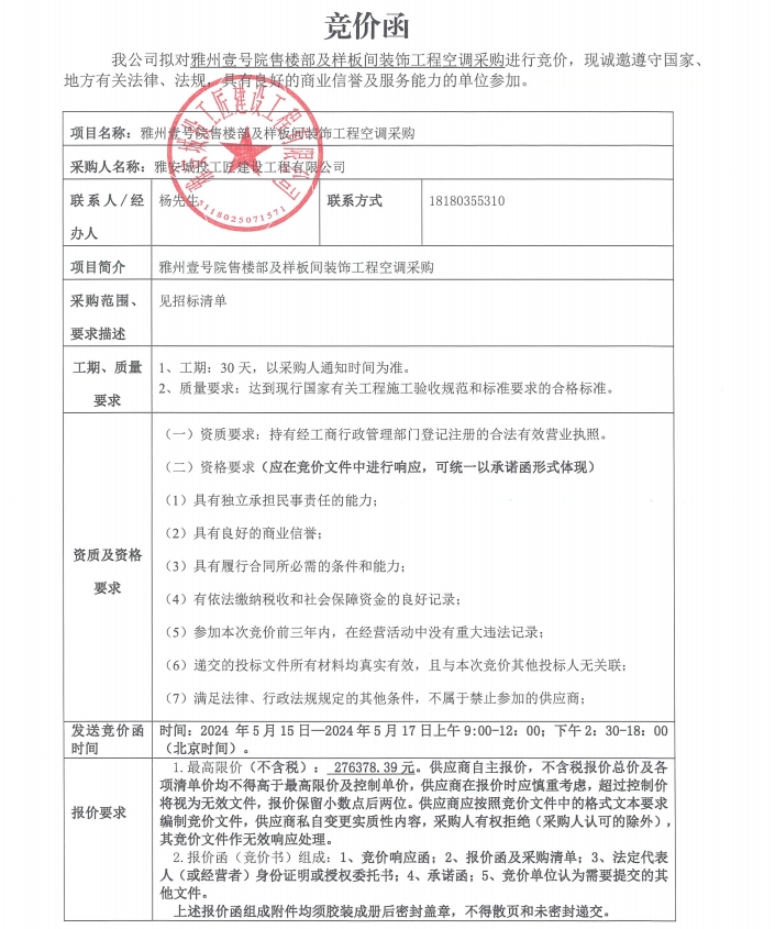 雅州壹號院售樓部及樣板間裝飾工程空調采購競價公告