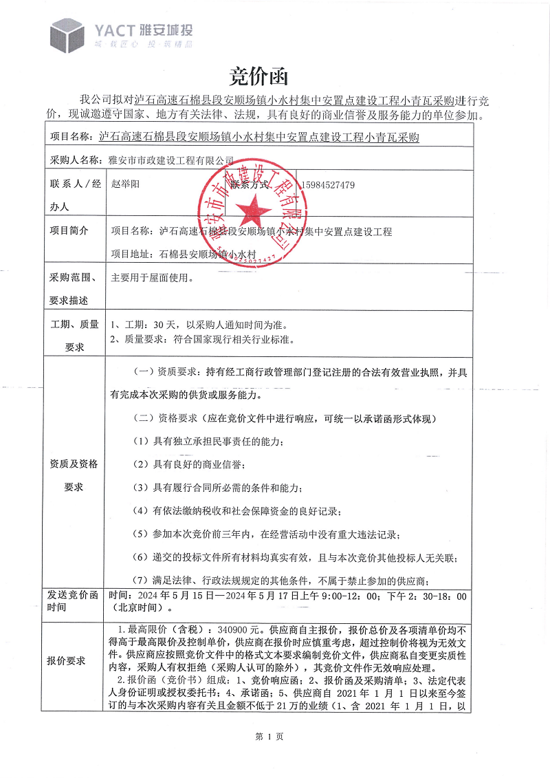 瀘石高速石棉縣段安順場鎮(zhèn)小水村集中安置點建設(shè)工程項目施工瓦片采購競價公告