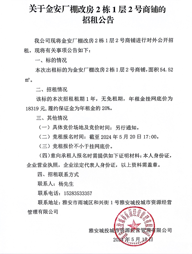 關于金安廠棚改房2棟1層2號商鋪的招租公告