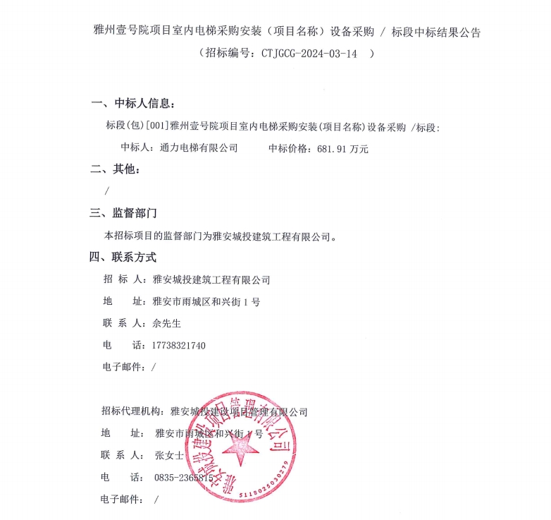 雅州壹號院項目室內(nèi)電梯采購安裝(項目名稱)設備采購/標段中標結(jié)果公告