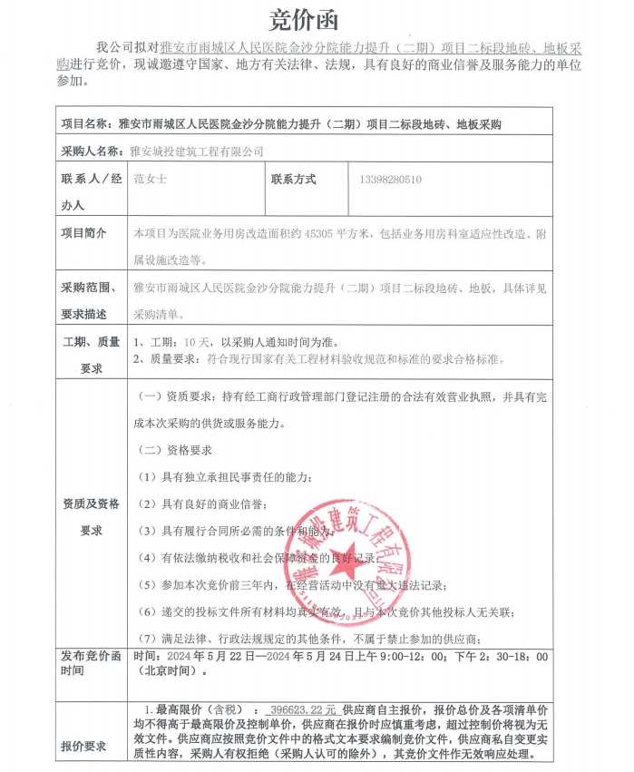 雅安市雨城區(qū)人民醫(yī)院金沙分院能力提升(二期)項(xiàng)目二標(biāo)段地磚、地板采購(gòu)競(jìng)價(jià)公告