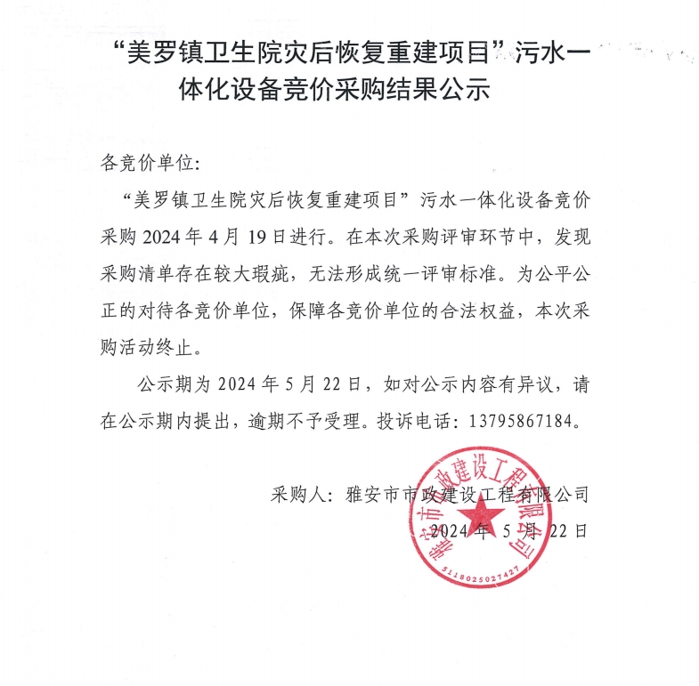 美羅鎮(zhèn)衛(wèi)生院災(zāi)后恢復(fù)重建項(xiàng)目污水一體化設(shè)備競價(jià)采購結(jié)果公示