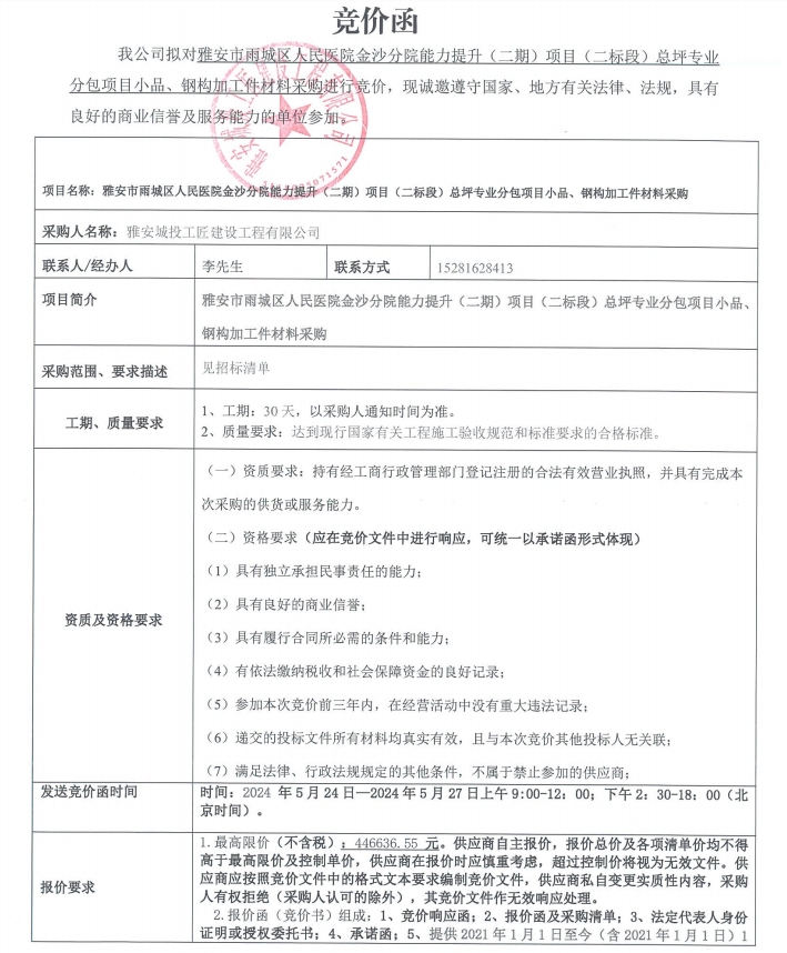附件1:雅安市雨城區(qū)人民醫(yī)院金沙分院能力提升(二期)項(xiàng)目(二標(biāo)段)總坪專業(yè)分包項(xiàng)目小品、鋼構(gòu)加工件材料采購競價(jià)函