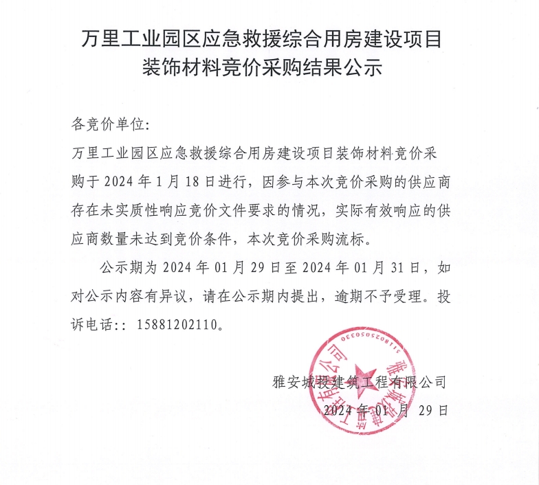 萬里工業(yè)園區(qū)應(yīng)急救援綜合用房建設(shè)項目裝飾材料競價采購結(jié)果公示