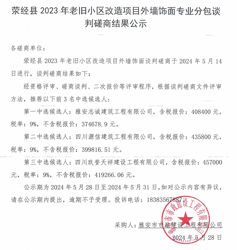 滎經縣2023年老舊小區(qū)改造項目外墻飾面專業(yè)分包談判磋商結果公示