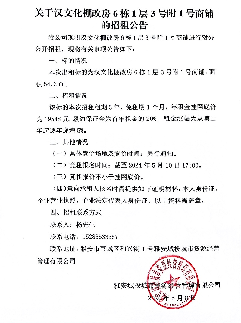 關(guān)于漢文化棚改房6棟1層3號(hào)附1號(hào)商鋪的招租公告