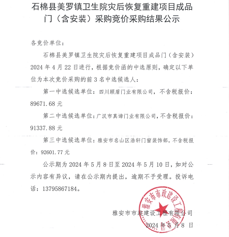 石棉縣美羅鎮(zhèn)衛(wèi)生院災后恢復重建項目成品門(含安裝)采購競價采購結果公示