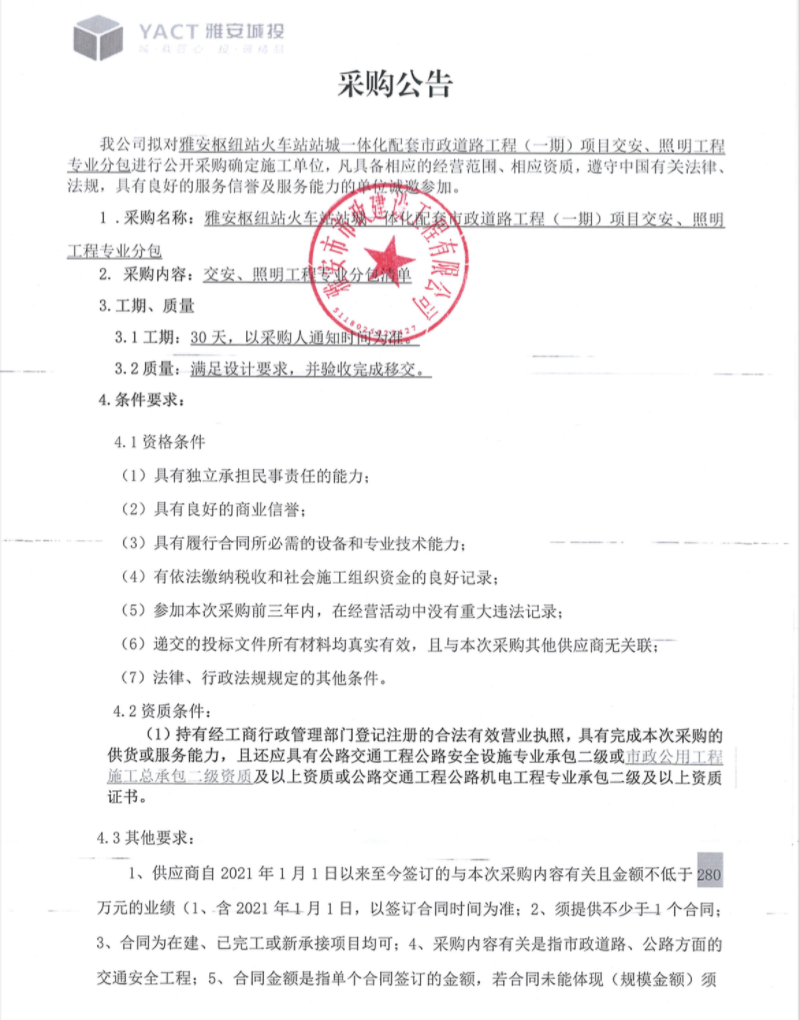 雅安樞紐站火車站站城一體化配套市政道路工程(一期)項目交安、照明工程專業(yè)分包采購公告