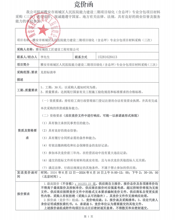 雅安市雨城區(qū)人民醫(yī)院能力建設(shè)二期項(xiàng)目綠化(含總坪)專業(yè)分包項(xiàng)目材料采購(gòu)(三次)競(jìng)價(jià)公告