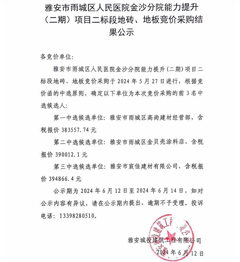 雅安市雨城區(qū)人民醫(yī)院金沙分院能力提升(二期)項(xiàng)目二標(biāo)段地磚、地板競價(jià)采購結(jié)果公示