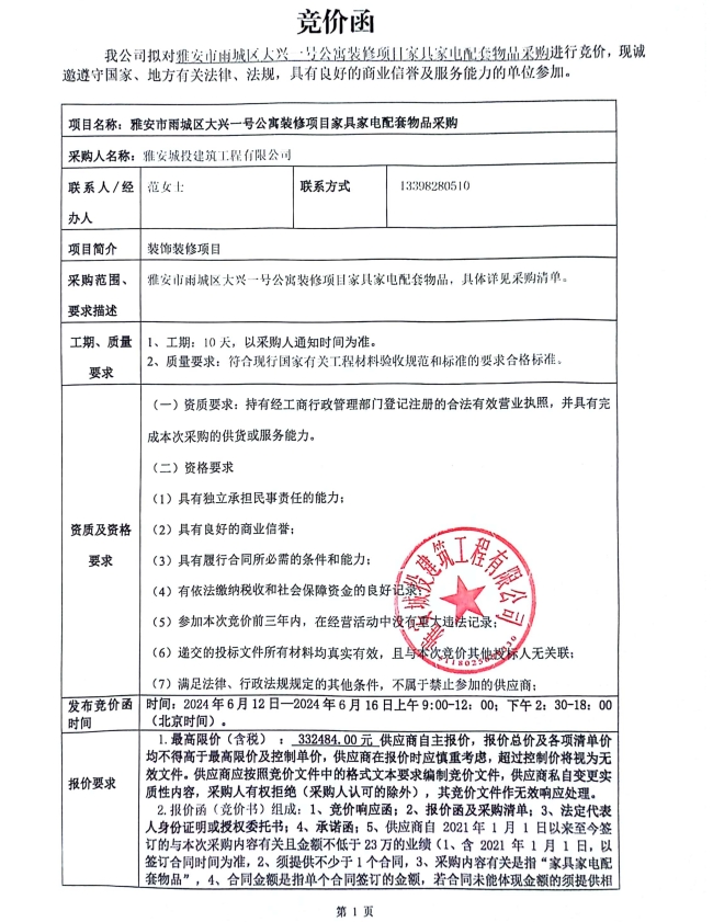 雅安市雨城區(qū)大興壹號公寓裝修項(xiàng)目家具電配套物品采購競價(jià)公告