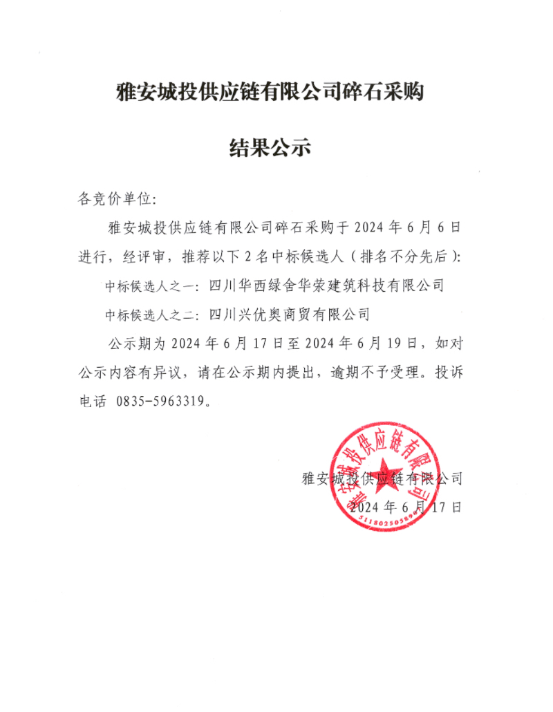 雅安城投供應(yīng)鏈有限公司碎石采購結(jié)果公示