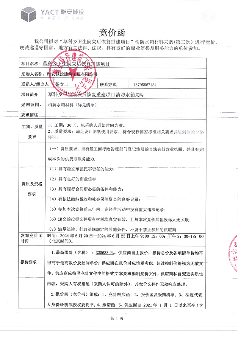 草科鄉(xiāng)衛(wèi)生院災(zāi)后恢復(fù)重建項(xiàng)目消防水箱(第三次)采購(gòu)競(jìng)價(jià)函