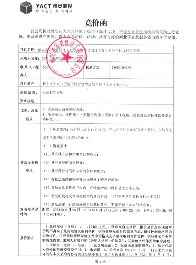 雅安市大興片區(qū)地下綜合管廊建設(shè)項(xiàng)目交安專業(yè)分包標(biāo)線材料采購(gòu)競(jìng)價(jià)公告