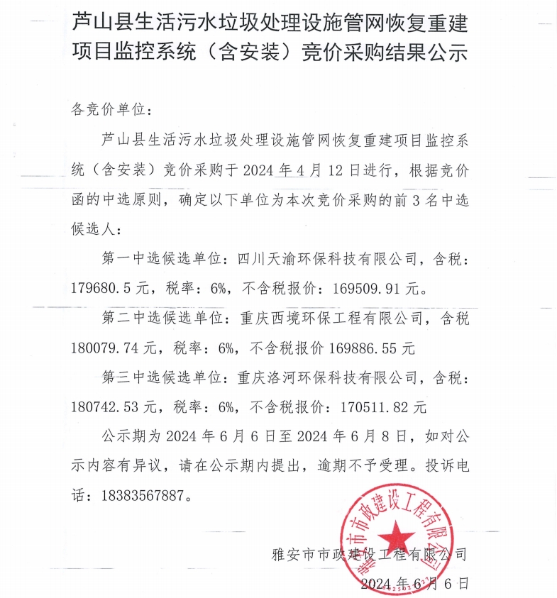 蘆山縣生活污水垃圾處理設(shè)施管網(wǎng)恢復(fù)重建項(xiàng)目監(jiān)控系統(tǒng)(含安裝)競(jìng)價(jià)采購(gòu)結(jié)果公示