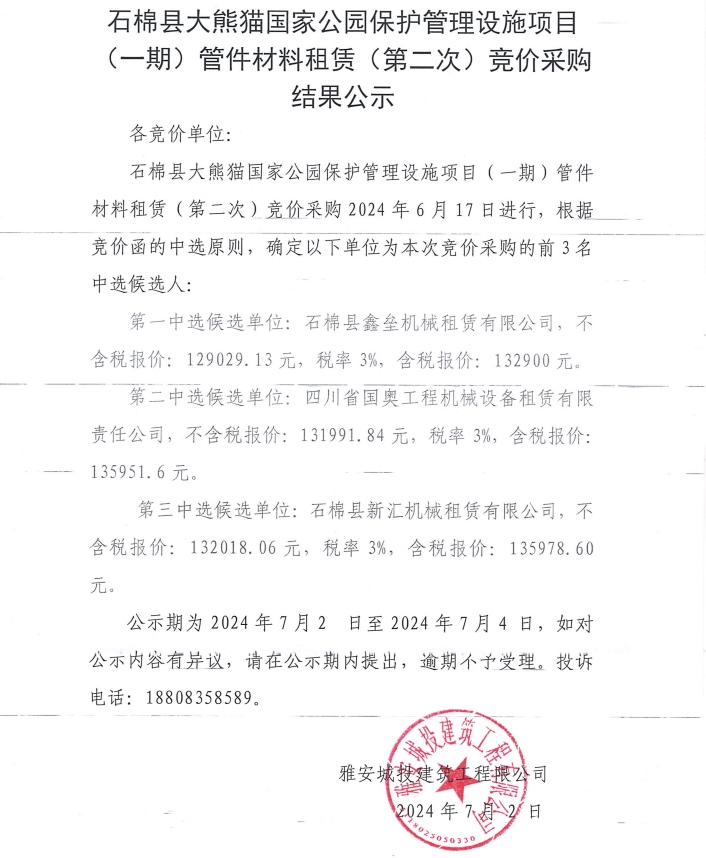 石棉縣大熊貓國家公園保護管理設施項目(一期)管件材料租賃(第二次)競價采購結果公示