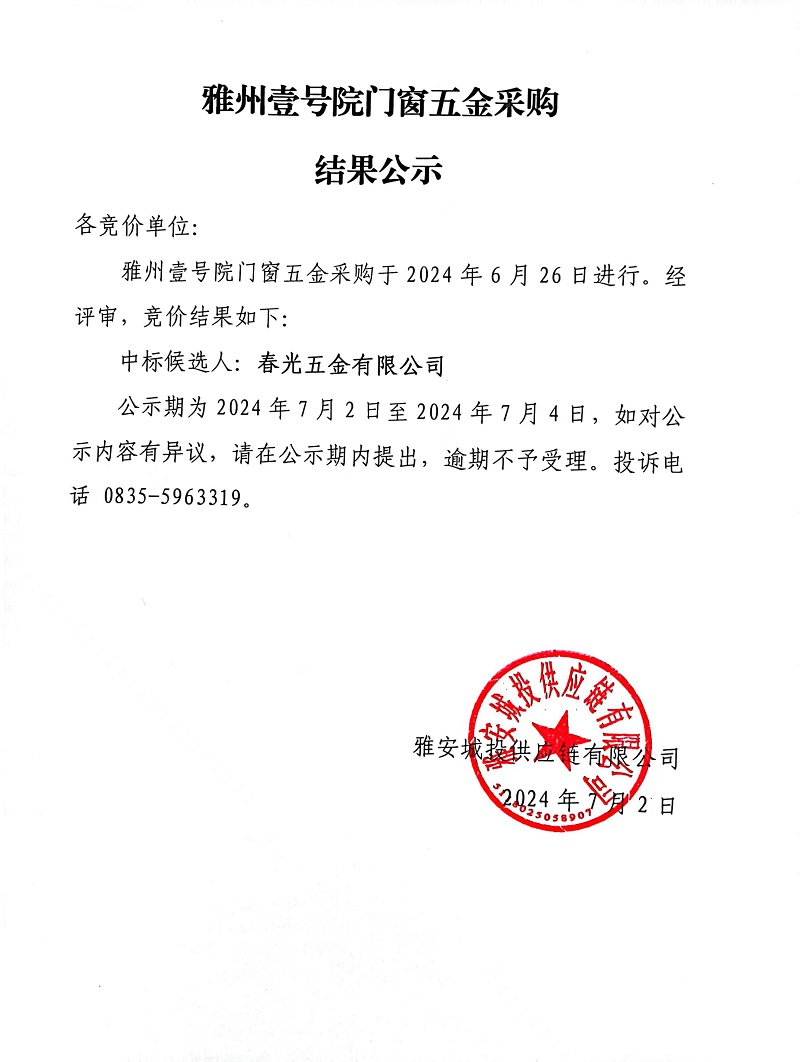 雅州壹號(hào)院門窗五金采購(gòu)結(jié)果公示