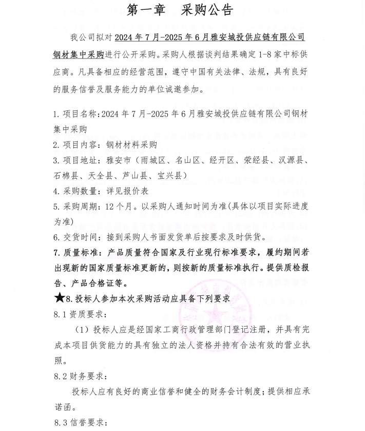 2024年7月-2025年6月雅安城投供應(yīng)鏈有限公司鋼材集中采購公告