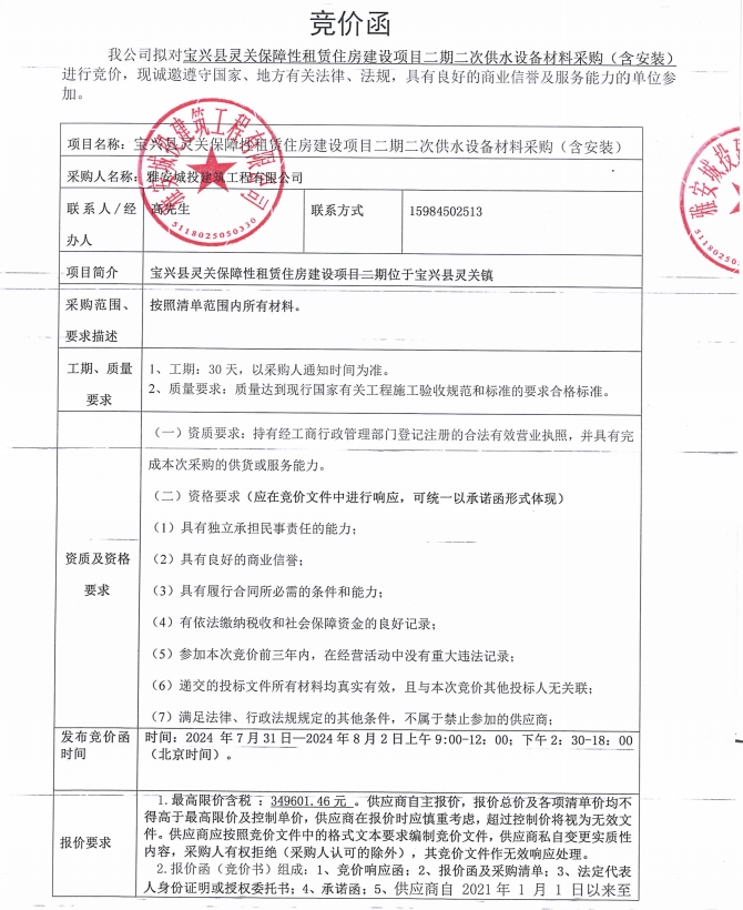 寶興縣靈關(guān)保障性租賃住房建設(shè)項(xiàng)目二期二次供水設(shè)備采購(含安裝)競價(jià)公告