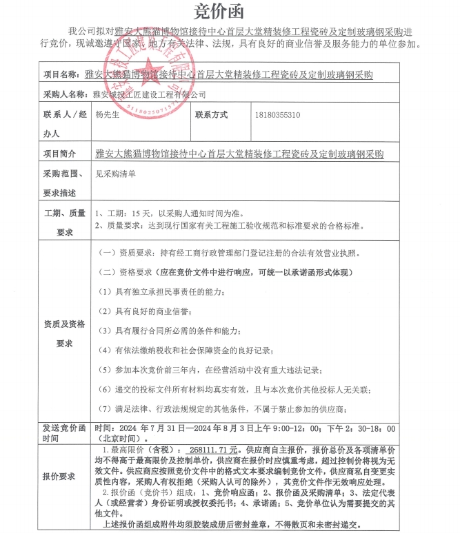 雅安大熊貓博物館接待中心首層大堂精裝修工程瓷磚及定制玻璃鋼采購(gòu)競(jìng)價(jià)公告