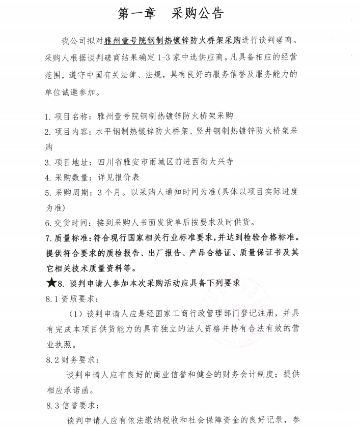雅州壹號(hào)院鋼制熱鍍鋅防火橋架采購公告