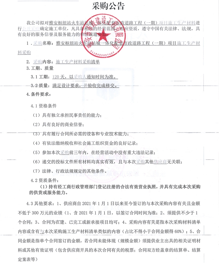 雅安樞紐站火車站站城一體化配套市政道路工程(一期)項目施工生產材料采購公告