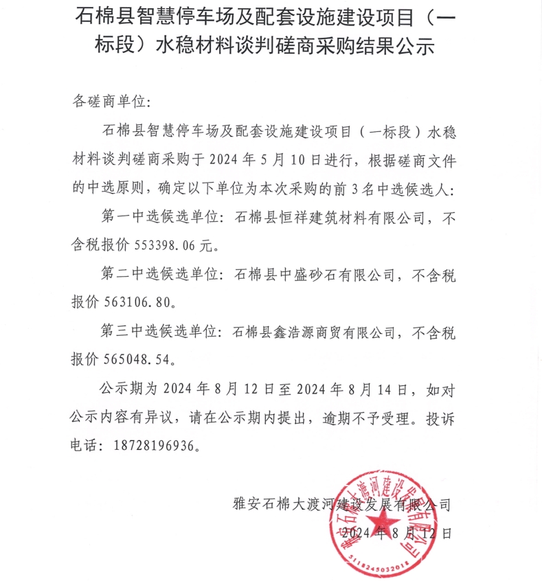 石棉縣智慧停車(chē)場(chǎng)及配套設(shè)施建設(shè)項(xiàng)目(一標(biāo)段)水穩(wěn)材料采購(gòu)談判磋商采購(gòu)結(jié)果公示