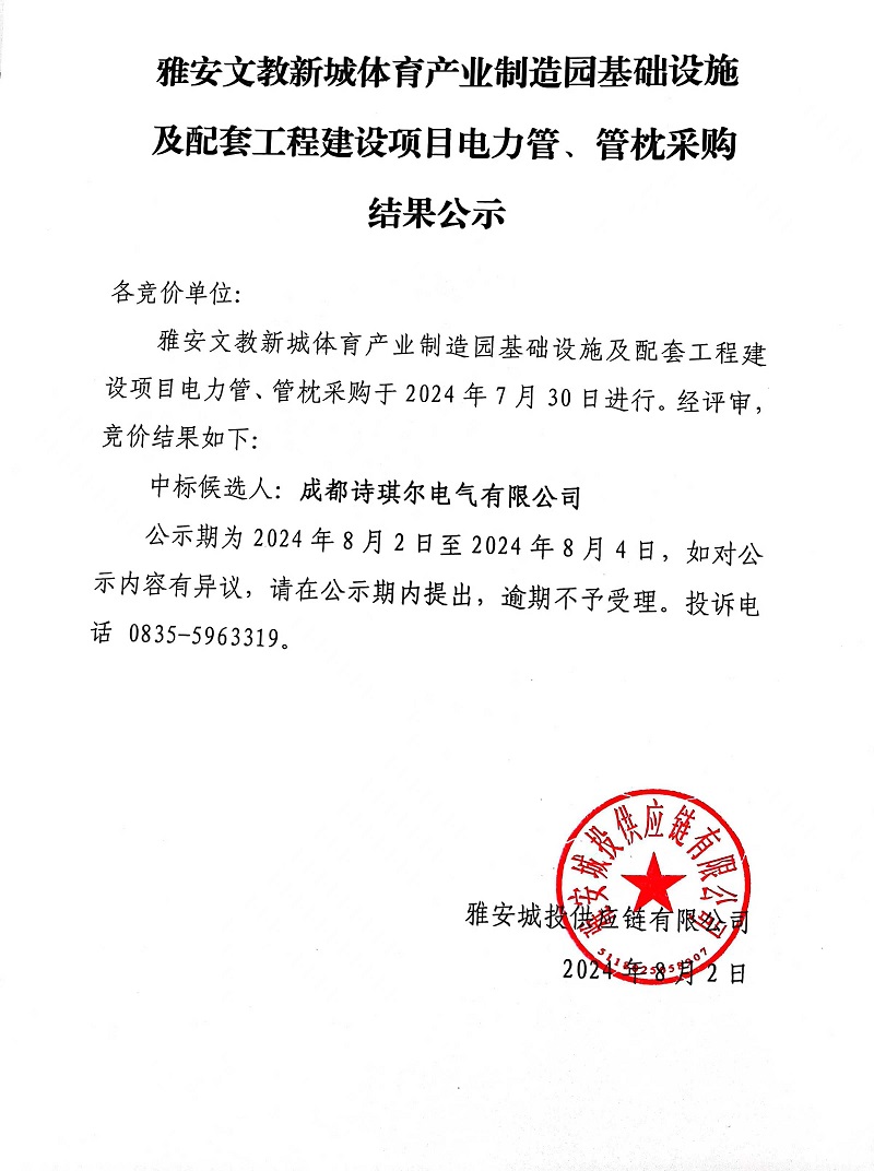 雅安文教新城體育產(chǎn)業(yè)制造園基礎(chǔ)設(shè)施及配套工程建設(shè)項目電力管、管枕采購結(jié)果公示