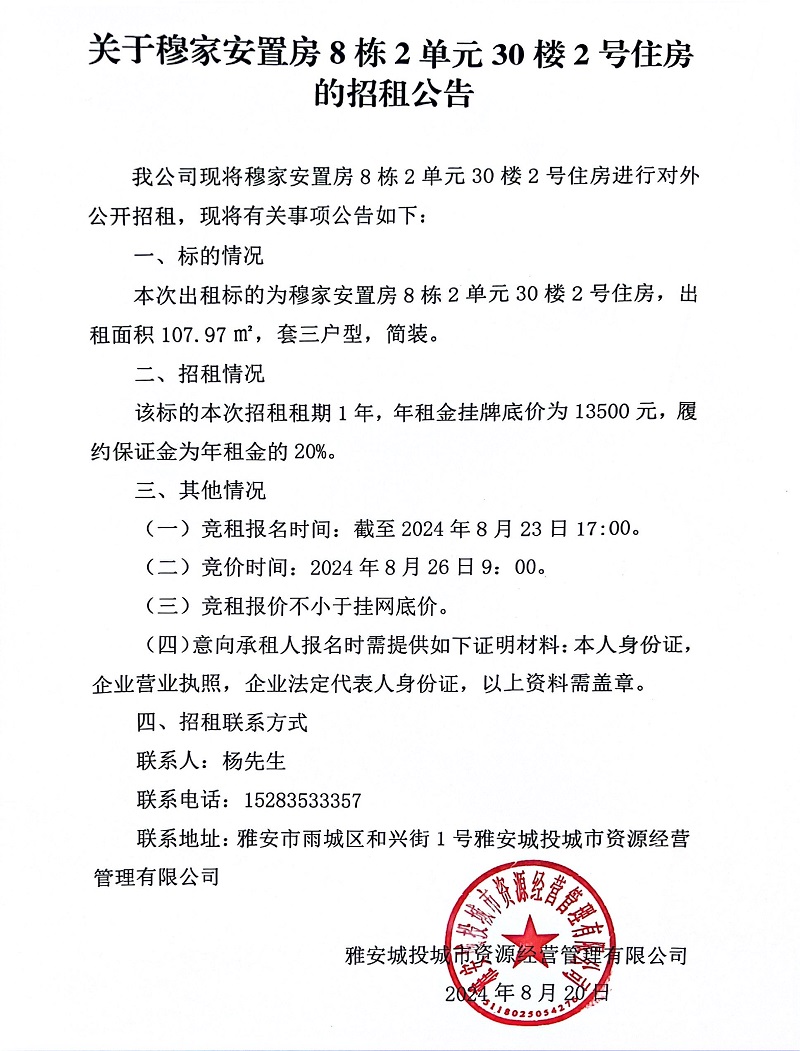 關(guān)于穆家安置房8棟2單元30樓2號(hào)住房的招租公告