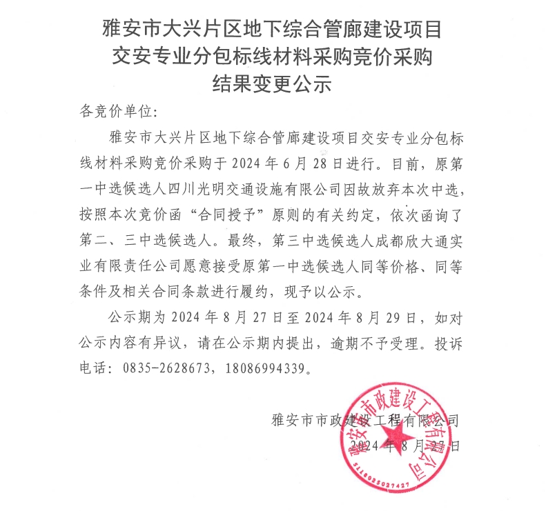 雅安市大興片區(qū)地下綜合管廊建設(shè)項(xiàng)目交安專業(yè)分包標(biāo)線材料采購(gòu)競(jìng)價(jià)采購(gòu)結(jié)果變更公示