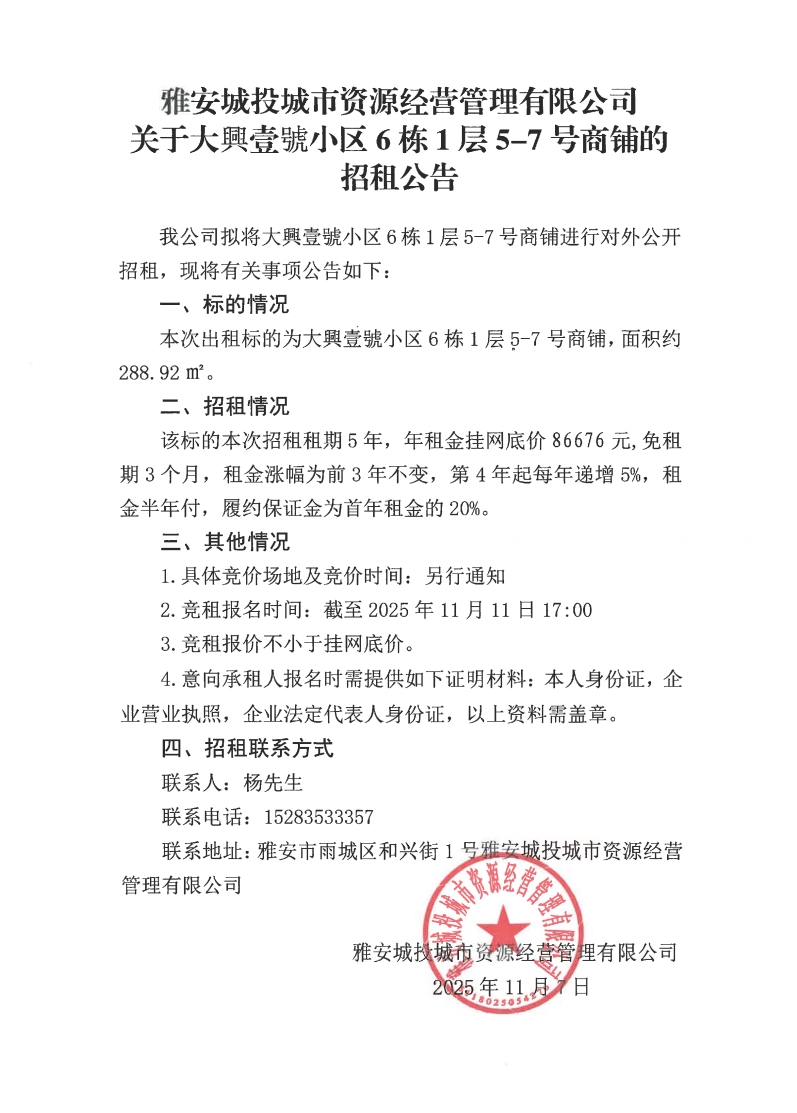 雅安城投城市資源經(jīng)營管理有限公司關(guān)于大興壹號(hào)小區(qū)6棟1層5-7號(hào)商鋪的招租公告