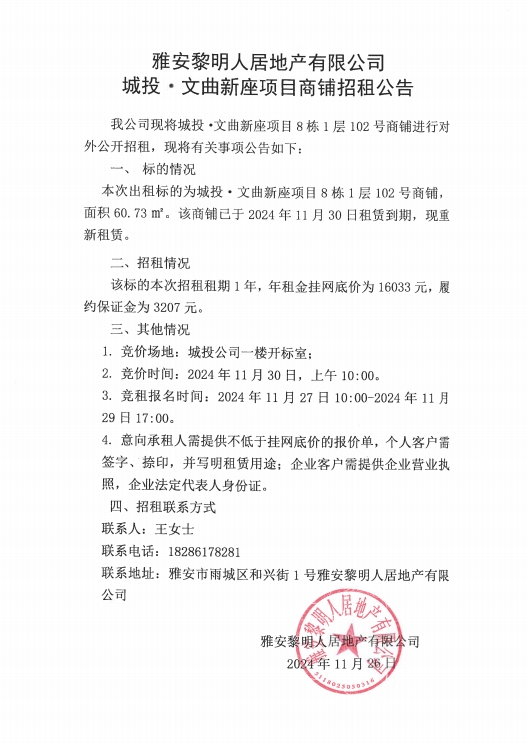 雅安黎明人居地產(chǎn)有限公司城投·文曲新座項(xiàng)目商鋪招租公告