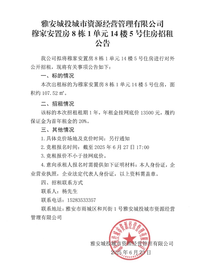 雅安城投城市資源經營管理有限公司穆家安置房8棟1單元14樓5號住房招租公告