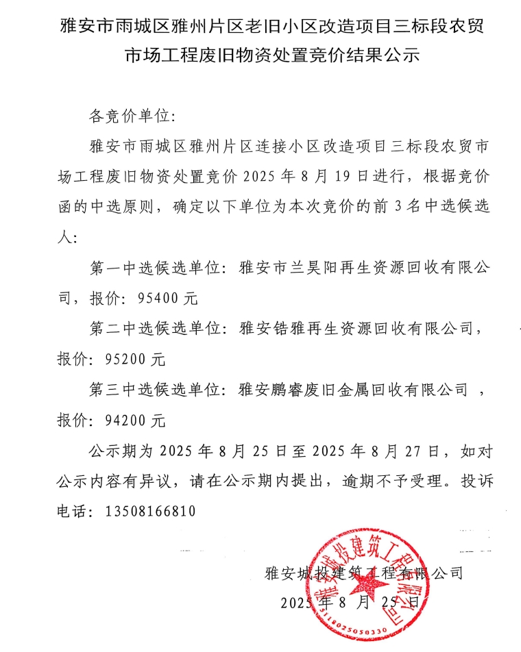 雅安市雨城區(qū)雅州片區(qū)老舊小區(qū)改造項目三標段農(nóng)貿(mào)市場工程廢舊物資處置競價結果公示