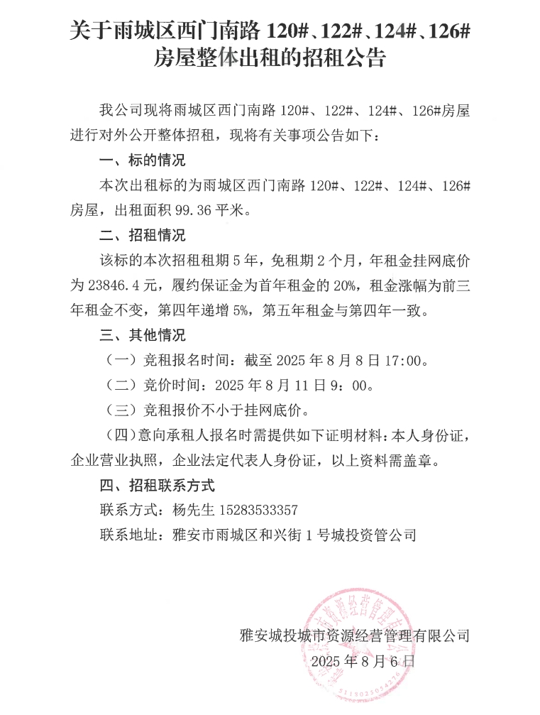 關(guān)于雨城區(qū)西門南路120#、122#、124#、126#房屋整體出租的招租公告