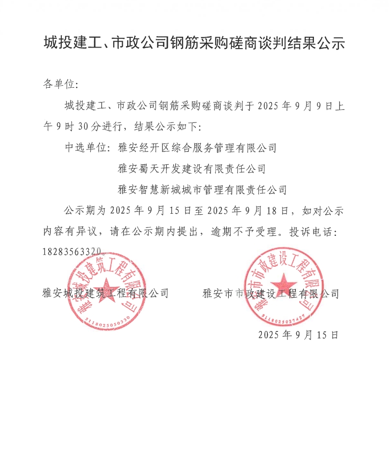 城投建工、市政公司鋼筋采購磋商談判結(jié)果公示