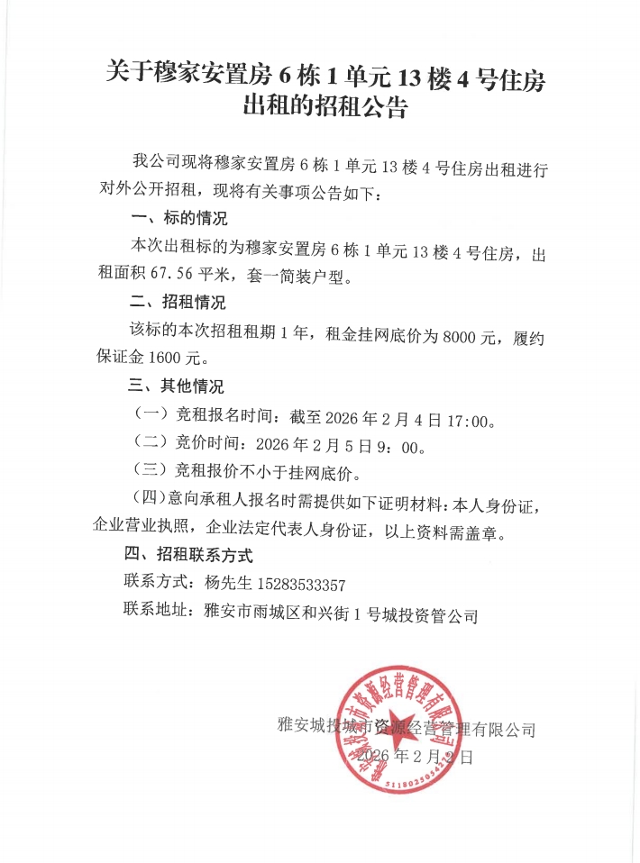 關于穆家安置房6棟1單元13樓4號住房出租的招租公告
