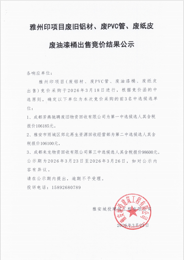 雅州印項(xiàng)目廢舊鋁材、廢PVC管、廢紙皮、廢油漆桶出售競(jìng)價(jià)結(jié)果公示