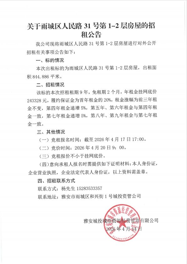 關(guān)于雨城區(qū)人民路31號第1-2層房屋的招租公告