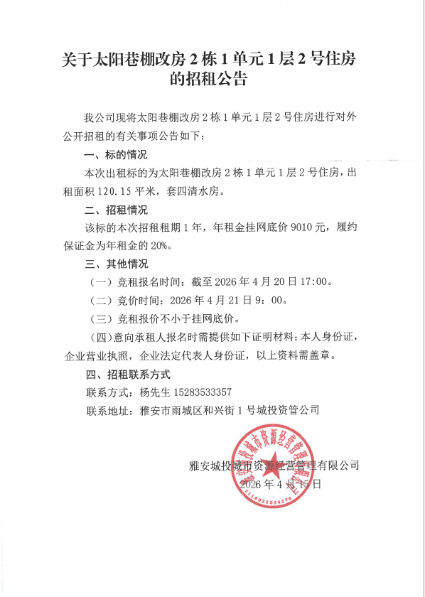 關(guān)于太陽巷棚改房2棟1單元1層2號(hào)住房的招租公告
