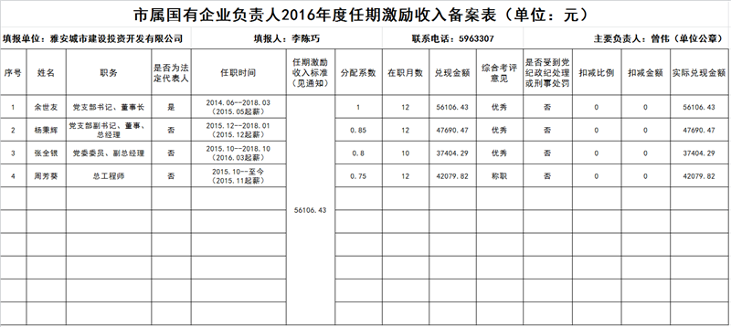 市屬國有企業(yè)負(fù)責(zé)人2016年度任期激勵(lì)收入備案表