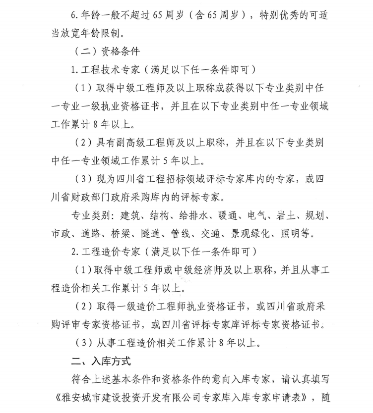 雅安城市建設投資開發(fā)有限公司關于征集入庫專家的公告
