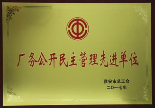 2017年7月 我公司被評為“全市廠務(wù)公開民主管理先進(jìn)單位”